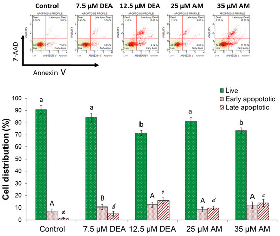 Effect of DEA and AM on apoptosis in MDA-MB-231 cells. We treated the MDA-MB-231 cells with 0, 7.5, or 12.5 µM DEA or with 25 or 35 µM AM for 6 h before determining the type of cell death using flow cytometry followed by double-staining with FITC-Annexin V and 7-AAD. The results are presented as representative scatter plots and bar diagrams of three independent experiments. The x (Annexin V) and y (viability) axes of the scatter plots indicate FITC-Annexin V and 7-AAD fluorescence intensities, respectively. In the bar diagrams, live (green bars), early (middle bars), and late (striped bars) apoptotic cells are expressed as the percentage of the total cell number mean ± SEM. The different characters above the bars denote groups significantly (p < 0.05) different from the others of the same set.