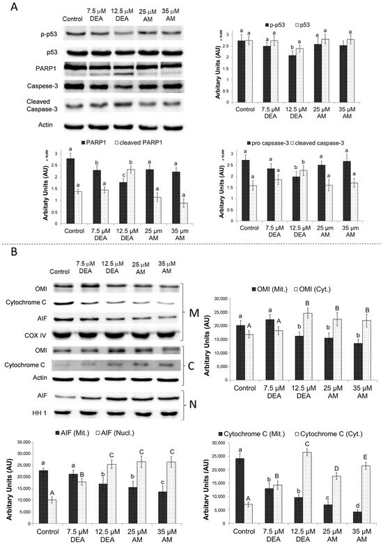 After treating the cells according to the same protocol for 24 h, we also studied the effects of these compounds on various markers of apoptosis. We performed immunoblotting to determine transformation-related protein 53 (p53) phosphorylation, caspase-3 cleavage, and poly(ADP-ribose) polymerase 1 (PARP1) cleavage [43] from whole-cell homogenates. Mitochondrial, nuclear, and cytosolic fractions of identically treated cells were also isolated and the mitochondrial release of cytochrome C, high-temperature requirement protein A2 (OMI), and apoptosis-inducing factor (AIF) into the cytosol and nucleus was measured by immunoblotting [44]. The substances did not seem to significantly affect the steady-state levels or the phosphorylation of p53 (Figure 10A). DEA, however, induced caspase-3 and PARP1 cleavage in a concentration-dependent manner, while AM did not affect these processes (Figure 10A). On the other hand, both substances caused OMI, AIF, and cytochrome C release from the mitochondria in a concentration-dependent manner, and interestingly, the effect of AM on these markers was stronger than that of DEA (Figure 10B).