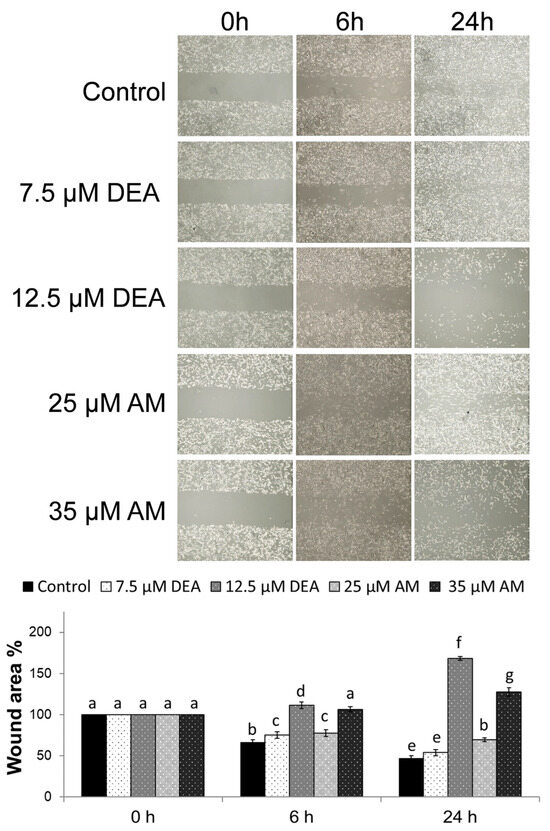 Effects of DEA on wound healing in MDA-MB-231 cell line. A wound was inflicted onto semi-confluent cultures of MDA-MB-231 cells and the cultures were exposed to 0, 7.5, or 12.5 µM DEA or 25 or 35 µM AM for 12 h. The data are presented as representative images of the wounds taken at 0, 6, and 24 h, and the wound area is expressed as the percentage of untreated plates at the 0 h time-point, mean ± SEM of two independent experiments running in duplicates. The letters above the bars denote groups significantly (p < 0.05) different from the others of the same set.