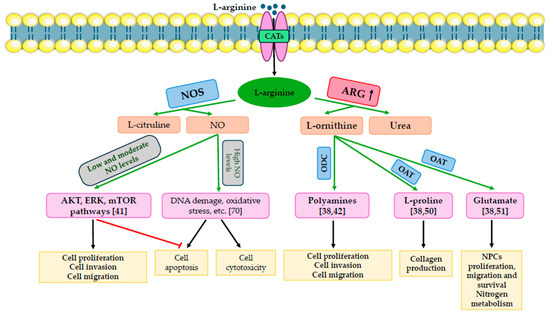 Cellular and molecular consequences of the imbalance of NO and L-arginine action in cancer. NOS metabolizes L-arginine to generate both L-citrulline and NO. At high NO concentrations, cellular apoptosis, oxidative stress, DNA damage, and cellular toxicity occur. Moderate and low amounts of NO prevent cells from apoptosis through the ERK, mTOR, and AT signaling pathways, and they promote the development of cancers and the invasion of cancer cells. Arginases hydrolyze L-arginine to generate L-ornithine and urea. In the reaction catalyzed by OAT, L-ornithine is transformed to L-proline and glutamate. ODC catalyzes the reaction of polyamine generation from L-ornithine. L-proline participates in the production of collagen. In the case of cancer, the balance between NO and L-arginine is disturbed. There is increased arginase activity, which depletes L-arginine to a greater extent, causing reduced NO production and thus increasing L-ornithine levels. Then, L-ornithine catalyzed by OAT and ODC increases the proline, glutamate, and, most importantly, polyamine generation. In this way, cancer cell migration, invasion, and proliferation occur. Because the NO level is low, there is no cellular apoptosis by the AKT, ERK, and mTOR pathways but further proliferation of these cells. OAT, ornithine aminotransferase; NOS, nitric oxide synthase; ARG, arginase; ODC, ornithine decarboxylase; NO, nitric oxide; AKT, protein kinase B; CAT, cationic amino acid transporter; mTOR, mammalian target of rapamycin; ERK, extracellular signal-regulated kinase; NPCs, neural progenitor cells.