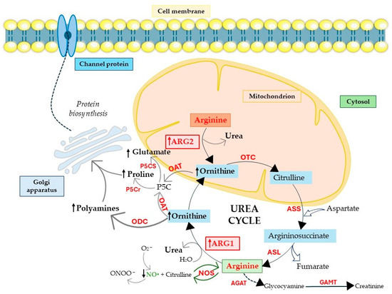 Arginases, as enzymes of the urea cycle taking place in the liver, are primarily responsible for the catalysis of amino acids. In detail, ARG1 cleaves L-arginine into L-ornithine and urea, and this phenomenon allows for the removal of toxic ammonia in the last stage of the urea cycle [1,36,37,38]. However, in extrahepatic tissues, arginases are responsible for the hydrolysis of exo- and endogenous L-arginine [38]. L-ornithine obtained from the hydrolysis process can be metabolized in the decarboxylation reaction by ornithine decarboxylase (ODC, 4.1.1.17) to putrescine [37,38,39]. Putrescine is a substrate necessary for the synthesis of higher polyamines, such as spermine and spermidine [1,40,41]. Polyamines can also be produced from agmatine (endogenous guanido amine) through the activity of arginine decarboxylase (ADC, 4.1.1.4) [38]. In fact, polyamines are involved in the proper course of many metabolic processes; they are primarily responsible for cell growth and proliferation, as well as tissue repair [36,38,42]. As biogenic compounds, they stimulate the synthesis of phospholipids, ribonucleic acids (RNAs), deoxyribonucleic acids (DNAs), and proteins. Polyamines are components of cytoplasmic membranes and participate in the transport of metabolites and the regulation of ion channels [38,43]. Polyamines may also play an important role in carcinogenesis [38]. They are overexpressed in rapidly dividing cells such as cancer cells, e.g., in lung, breast, and colon cancer. This is related to the increased concentration of not only polyamines themselves but also genes and enzymes involved in their biosynthesis—including arginases [44,45,46]. López-Contreras et al. observed that polyamine levels were increased in non-small-cell lung cancer (NSCLC) with a change in arginine metabolism [47]. In the study conducted by Srivastava et al., stimulation of the ARG1 pathway was observed in head and neck squamous-cell carcinoma (HNSCC), as well as increased expression of ODC, which is essential for polyamine biosynthesis and promotes tumor growth [48]. The above studies indicate the pro-cancer characteristics of the increased activity of arginases and polyamine synthesis in various types of cancer [47,48,49].