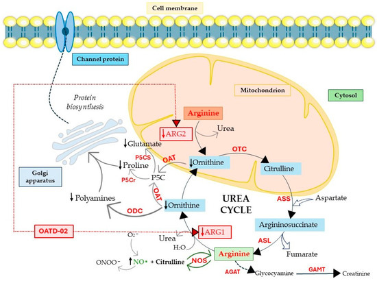 OATD-02 inhibits intracellular ARG1 and ARG2. The ARG1/ARG2 inhibitor OATD-02 inhibits the activity of cytosolic ARG1 and mitochondrial ARG2 by preventing the degradation of arginine by arginase. Arginine can therefore use NOS to stimulate NO synthesis and the production of chemokines and pro-inflammatory cytokines, which leads to T cell activation and proliferation. The inhibition of both arginases causes reduced production of L-ornithine. ODC does not catalyze the decarboxylation of L-ornithine to form putrescine, a substrate necessary for the synthesis of polyamines, which translates into reduced polyamine generation, thus inhibiting further proliferation of cancer cells. Additionally, OAT does not catalyze the reaction of converting L-ornithine to 5PC, which translates into reduced proline and glutamate generation. ARG, arginase; ODC, ornithine decarboxylase; NOS, nitric oxide synthase; ASL, argininosuccinate lyase; ASS, argininosuccinate synthase; OTC, ornithine transcarbamylase; OAT, ornithine aminotransferase; P5Cr, P5C reductase; P5CS, P5C synthase; P5C, Δ1-pyrroline-5-carboxylate; AGAT, glycine amidinotransferase; GAMT, guanidinoacetate methyltransferase, → direct path; −→ multistep path.