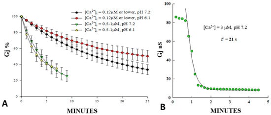 Gj of Novikoff hepatoma cell pairs internally dialyzed via patch pipettes filled with solutions well buffered for H+ and Ca2+. [Ca2+]i = 0.12 μM or lower, caused Gj to drop to 40-50% of initial values with τ = 35.2 and 22.3 min, at pHi = 6.1 and 7.2, respectively (A). This is the normal Gj decay in cells studied by whole-cell patch clamp. [Ca2+]i = 0.5–1.0 μM, caused Gj to decrease to 25% of initial values with τ’s = 5.9 and 6.2 min, at pHi = 6.1 and 7.2, respectively (A). [Ca2+]i = 3 μM (pH = 7.2) uncoupled the cells in less than 1 min with τ = ~21 s (B). This confirms that the gating mechanism is insensitive to a cytosolic acidification of pH 6.2, if [Ca2+]i is carefully buffered with BAPTA. Adapted from Ref. [].