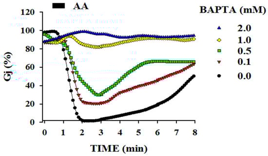 Gj of Novikoff hepatoma cell pairs exposed for 20 s to 20 mM arachidonic acid (AA) while being internally dialyzed via patch pipettes containing solutions buffered for Ca2+ with BAPTA (pH = 7.2). The drop of Gj is completely prevented by buffering [Ca2+]i with BAPTA. Note that even BAPTA concentrations as low as 0.1 mM are effective. Adapted from Ref. [].