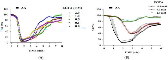 Gj of Novikoff hepatoma cell pairs exposed for 20 s to 20 mM arachidonic acid (AA) while being internally dialyzed via patch pipettes containing solution buffered for Ca2+ with different [EGTA] ((A,B); pH = 7.2). EGTA is 10 times less effective than BAPTA (see Figure 2) in inhibiting the AA effect on Gj. This is consistent with evidence that EGTA is significantly less efficient than BAPTA in buffering [Ca2+]i. Adapted from Ref. [].