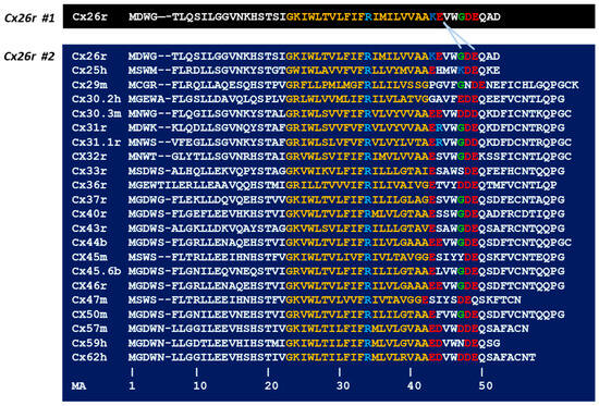 Even though human Cx40 and Cx43 are virtually identical in the “ExxxGDE” sequence (res. 42–48; MA res. 43–49), Xu and coworkers [] have reported that only channels made of Cx43 are Ca2+-gated (via CaM activation); rev. in []. Based on the proposed model [,] this would be paradoxical, because Cx43 and human Cx40 channels should display the same Ca2+-gating sensitivity.