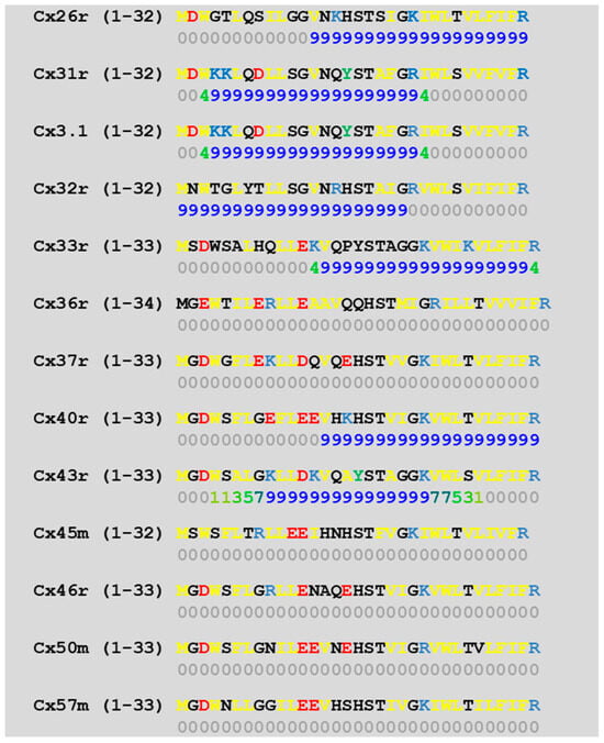 We studied the predicted CaM-binding sites of the NT and CT1 sequences of 13 connexins by a computer program (http://calcium.uhnres.utoronto.ca/ctdb/ctdb/sequence.html). Several connexins (Cx26, 31, 31.1, 32, 33, 40, and 43) were found to have a CaM-binding site at NT (Figure 6) and only a few (Cx31, 32, 36, and 43) at CT1 (Figure 7).