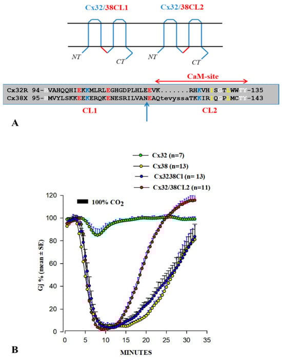 In 1996, in oocyte pairs of Xenopus, we started testing the gating sensitivity to CO2 of channels composed of chimeras and mutants of Cx32 and Cx38, two types of channel that are opposite in chemical gating sensitivity [,]. In fact, 3 min application of 100% CO2 decreases Gj of Cx38 channels to zero, whereas it decreases Gj of Cx32 channels by only ~15% (Figure 8B).
