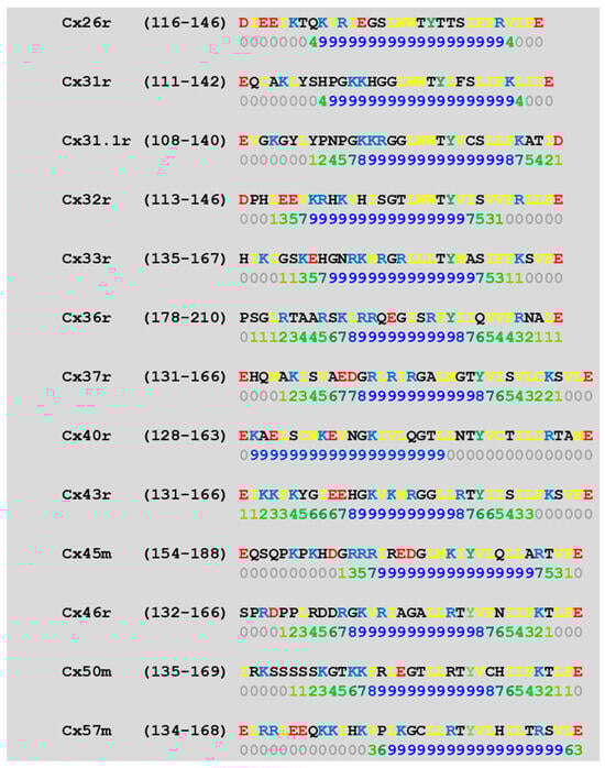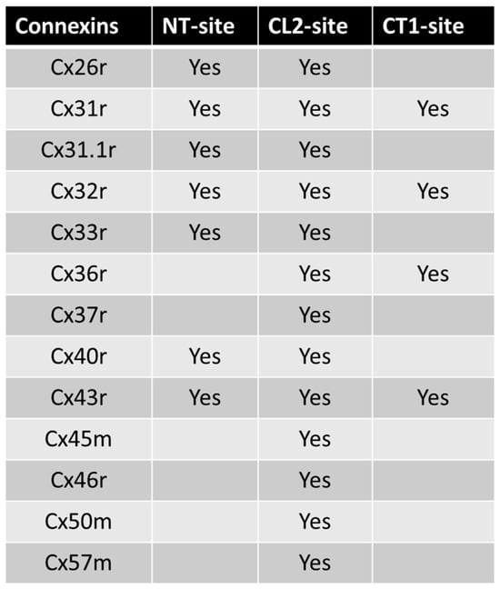Xu et al. [] studied N2a cells that expressed human Cx43 or Cx40 by whole-cell patch clamp. With ionomycin addition, [Ca2+]i increased threefold and Gj decreased by 95%; the Ca2+-induced drop in Gj was prevented by application of the CaM inhibitor CDZ and was reversed by adding 10 mM EGTA to a Ca2+-free solution []. Addition of a Cx43 peptide corresponding to the CL2’s CaM-binding domain (res. 136–158) to the pipette solutions abolished gating as well, while a scrambled peptide or the Ca2+/CaM-dependent kinase II’s inhibitory peptide (res. 290–309) did not []. The data prove that the CaM-binding domain of CL2’s is a major player in Cx43’s gating. A summary of the predicted CaM-binding sites of thirteen murine connexins is shown in Figure 10.