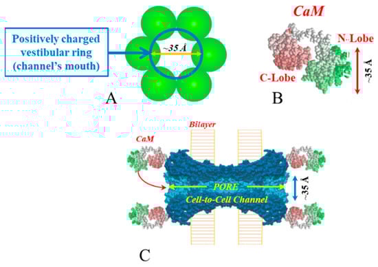 Figure 12. The positively charged channel’s vestibule (A,C) and the negatively charged lobes of CaM (B) are ~25 × 35 Å in diameter. Thus, a CaM lobe could fit well within the positively charged connexon’s vestibule (A,C). In C, the channel is cut along its length to show the pore’s diameter (light blue area) throughout its entire length. CaM and connexon images (B,C) were generously provided to us by Drs. Francesco Zonta and Mario Bortolozzi (VIMM, University of Padua, Italy).