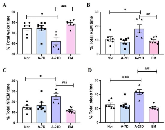 The effect of the earthing mat on EEG sleep architecture and profile is shown in Figure 1. EEG signals were recorded for 12 h. In the A-21D group, there was a significant reduction in wake time (p < 0.05, Figure 1A) and a marked increase in REM (p < 0.05, Figure 1B), NREM (p < 0.05, Figure 1C), and total sleep (p < 0.001, Figure 1D) compared with the Nor group. The A-21D group exhibited a significantly decreased wake time (p < 0.001, Figure 1A) and increased REM (p < 0.01, Figure 1B), NREM (p < 0.001, Figure 1C), and total sleep (p < 0.001, Figure 1D) compared to the EM group.