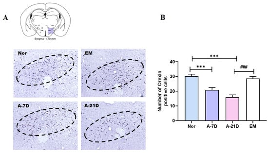 Orexin neurons within the LH are pivotal in governing the modulation of sleep–wake patterns. We examined orexin expression in the LH (Figure 2) and found that the number of orexin-positive cells was lower in the A-7D group and A-21D group than in the Nor group (p< 0.001; Figure 2). The A-21D group exhibited a significantly decreased number of orexin-positive cells compared to the EM group (p < 0.001, Figure 2).