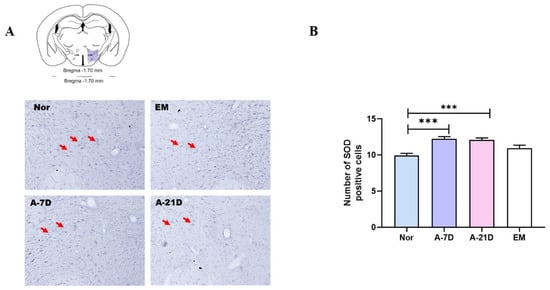 The evaluation of the SOD-immunoreactive cells per section of the LH is shown in Figure 3. The expression of the SOD-immunoreactive neurons in the A-7D and A-21D groups was significantly increased compared to the Nor group (p < 0.001, Figure 3).