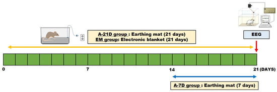 The subjects were divided into four groups: normal (Nor; n = 6), earthing mat exposure for 7 days (A-7D; n = 7), earthing mat exposure for 21 days (A-21D; n = 5), and electronic blanket exposure for 21 days (EM; n = 7). Electroencephalogram (EEG) electrodes were surgically implanted to facilitate polygraphic recordings, following the guidelines delineated in the Paxinos and Watson stereotaxic atlas [20]. Surgical anesthesia was induced with intraperitoneal pentobarbital (40 mg/kg). Subsequently, the rats were subjected to chronic implantation of a head mount. The transmitter body was subcutaneously placed off the midline, posterior to the scapula, secured to the skin, and stabilized using three sutures. Skull-mounted electrodes were secured with screws and dental cement. All surgical interventions were performed using a stereotaxic methodology in an aseptic environment. Postoperatively, each rat was allowed a 7-day recovery period in separate transparent enclosures.