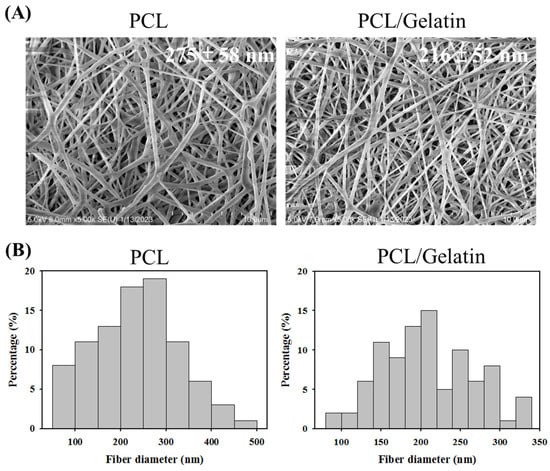 The scanning electron microscope (SEM) micrograph ((A), bar = 10 μm), and fiber diameter distribution (B) of PCL and PCL/gelatin nanofiber membrane scaffolds.