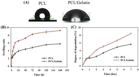 The swelling ratio of the NMSs shown in Figure 2B indicates very fast water absorption kinetics. The swelling ratio reaches ~5 or ~9 in 120 h, depending on the type of NMS. The swelling ratio of PCL/gelatin is higher than that of PCL due to its higher hydrophilicity, which supports the results of the contact angle measurements. The degradability of PCL and PCL/gelatin NMSs in collagenase solution at different time intervals was evaluated. Unlike, PCL, gelatin as a denatured protein from collagen can be degraded by collagenase, which makes PCL/gelatin NMSs degrade faster than PCL/gelatin NMSs (Figure 2C) [41]. Collagenase can only break down gelatin but not the main component PCL in the PCL/gelatin nanofibers. It can hydrolyze peptide bonds in the Pro-X-Gly-Pro repeated amino acid sequence in gelatin through proteolytic cleavage of a peptide bond formed between glycine (Gly) and a neutral amino acid (X). With the accelerated enzymatic degradation study in a collagenase solution, the degradation study underlines a faster deterioration rate of PCL/gelatin NMSs in vivo. Nonetheless, improved membrane hydrophilicity may be another possible cause of the enhanced degradation rate observed for PCL/gelatin NMSs in collagenase solution.