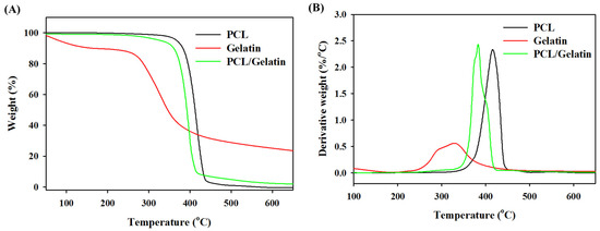 The thermal stability of PCL NMSs, PCL/gelatin NMSs, and gelatin powder were studied by TGA and DTA in Figure 3A,B. The TGA is a technique that measures the mass of a material as it is heated up while the DTA can measure the difference in temperature between the sample and a reference material as they are both heated up. These techniques can be used to study the thermal stability of materials and to identify the temperature at which they decompose. The PCL NMS shows single-staged thermal decomposition starting from 346 °C and ending at 430 °C. A peak temperature at 419 °C was found for PCL, and there was only 0.5% residual weight after complete decomposition at 650 °C. Gelatin shows some weight loss within 50 and 120 °C due to evaporation of absorbed water. A second-stage weight loss for gelatin is noted between 250 and 420 °C, corresponding to the thermal degradation of this protein. The peak temperature is 330 °C for gelatin, and the residual weight is 24% due to its natural polymer nature [42]. The PCL/gelatin NMS depicts thermal degradation starting at 275 °C and completing at 420 °C, leading to 2.0% residual weight due to the gelatin in the blend. As the calculated weight percent of gelatin in the PCL/gelatin NMS is 9.1%, the theoretical residual weight of this scaffold is 2.2% and close to the value obtained from TGA. There are two decomposition peak temperatures observed from the DTA curve: the first small broad peak starting as early as ~318 °C corresponded to gelatin degradation, and the second one corresponded to PCL decomposition between 383 and 407 °C [43]. The interaction between gelatin and PCL in the PCL/gelatin NMS may shift the peak temperature assigned to PCL in the PCL NMS (419 °C) to a lower value.