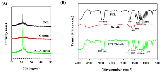Figure 4B represents the Fourier-transform infrared (FTIR) spectra of the PCL NMS, PCL/gelatin NMS, and gelatin powder. Several PCL characteristic bands were observed at 1170 cm−1 (symmetric C-O-C stretching), 1240 cm−1 (asymmetric C-O-C stretching), 1293 cm−1 (C-O and C-C stretching), 1727 cm−1 (carbonyl stretching), 2862 cm−1 (symmetric CH2 stretching), and 2949 cm−1 (asymmetric CH2 stretching) [26,44]. The gelatin showed bands at amide II bending at 1543 cm−1 and C=O stretching at 1669 cm−1 [42]. In the PCL/gelatin NMS, all characteristic peaks corresponding to PCL and gelatin were observed, suggesting all components were successfully integrated into the PCL/gelatin NMS prepared by electrospinning a blend polymer solution.