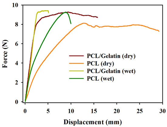 Typical tensile force–displacement curves of PCL and PCL/gelatin nanofiber membrane scaffolds in dry and wet conditions.