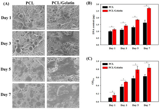 (A) The scanning electron microscopy (SEM) analysis of mesothelial cells in PCL and PCL/gelatin nanofiber membrane scaffolds (bar = 10 μm). The proliferation of mesothelial cells in PCL and PCL/gelatin nanofiber membrane scaffolds from cellular DNA contents (B) and MTT assays (C). * p < 0.05.