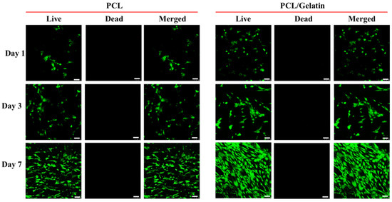 The cell viability was evaluated by live/dead staining and examined by laser scanning confocal microscopy. As shown in Figure 7, stacked confocal images indicate that the seeded cells are highly viable throughout the observation period from day 1 with negligible dead cells. The PCL/gelatin exhibits more live cells than PCL with elongated cell morphology on day 3. More sporadically distributed live cells showing elongated shapes were found on day 3 than on day 1 and still no dead cells could be observed as before. On day 7, gelatin-mediated cell proliferation leads to the vast increase in mesothelial cells in PCL/gelatin with an increased cell population distributed evenly within the scaffold. Additionally, a single layer of mesothelial cells developed in the NMSs may be sufficient to maintain the mesothelial phenotype and cell viability since only a few layers of mesothelial cells exist in a mesothelium layer in vivo. The macroporous nature of PCL and PCL/gelatin NMSs is anticipated to enable sufficient gas and nutrition exchange to maintain high cell viability and promote cellular growth for engineering a mesothelium layer.