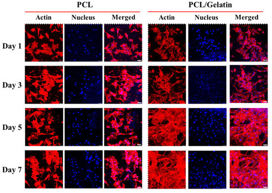Confocal microscopy images after actin cytoskeleton and nucleus staining of mesothelial cells in PCL and PCL/gelatin nanofiber membrane scaffolds. Bar = 25 μm.
