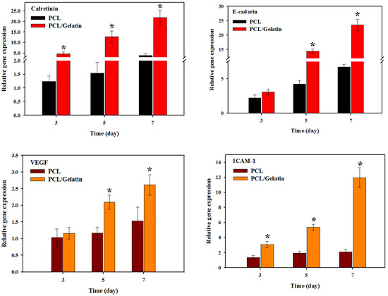 Quantitative real-time polymerase chain reaction (qRT-PCR) for quantifying the relative (normalized to day 1) gene expression levels of calretinin, E-cadherin, vascular endothelial factor (VEGF), and intercellular adhesion molecule (ICAM-1) by mesothelial cells in PCL and PCL/gelatin nanofiber membrane scaffolds. The glyceraldehyde 3-phosphate dehydrogenase (GAPDH) was used as a control. * p < 0.05 compared with PCL.