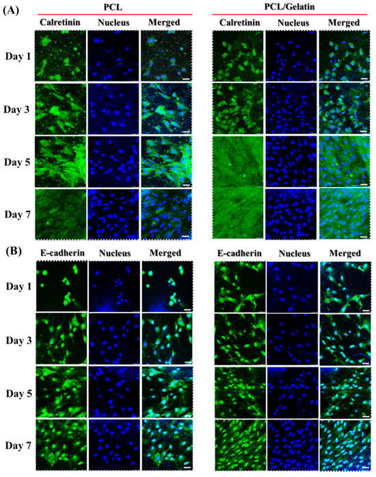 The expression of mesothelial marker proteins (calretinin and E-cadherin) was studied by immunofluorescence (IF) staining under a confocal microscope (Figure 10A,B). The seeded mesothelial cells could synthesize both proteins on day 1 as the cells proliferated in the scaffold. There was a consistent and ongoing increased expression of calretinin and E-cadherin from day 3 to day 7, as evidenced by the time-lapsed accumulation and distribution of these proteins in the scaffolds. However, the PCL/gelatin appears to have a higher rate of synthesis in the mesothelial marker proteins, especially in the case of calretinin. To compare the scaffold-dependent protein expression, we performed a semi-quantitative analysis of the area of the green fluorescence-stained regions in the confocal images. The synthesis of calretinin and E-cadherin differs significantly between scaffolds at each time point as anticipated (Table 2), suggesting that these essential mesothelial ECM proteins are efficiently synthesized in conjunction with cell proliferation. The incorporation of gelatin into PCL/gelatin NMSs significantly enhanced the synthesis of calretinin and E-cadherin and supports the use of this scaffold to offer an ECM-like milieu to preserve the mesothelial phenotype for mesothelial cell delivery to repair damaged mesothelium.