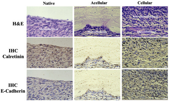 The hematoxylin and eosin (H&E) and calretinin and E-cadherin immunohistochemical (IHC) staining of retrieved mesothelium tissue 7 days post-implantation (bar = 10 μm). The abraded parietal peritoneum was repaired with PCL/gelatin nanofiber membrane scaffolds (NMSs) or PCL/gelatin NMSs + mesothelial cells as the acellular and the cellular group, respectively. The PCL/gelatin + mesothelial cell construct is prepared by culturing mesothelial cells in a PCL/gelatin NMS for 7 days in vitro before implantation. The native mesothelium tissue is shown on the left for comparison.