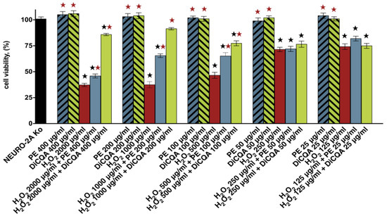 Cell viability of SH-SY5Y cells following 24 h exposure to various concentrations of H2O2: unprotected control group (red) and groups pretreated for 24 h with serial dilutions of Prenanthes purpurea extract (PE, in blue) and DiCQA (green) in a fixed 5:1 dose ratio. Blue and green bars in fill pattern represent the sole effects of PE and DiCQA monotreatments, respectively, on cell viability. All experiments were run in triplicate and data are expressed as mean ± SD. Statistical significance of the data was assessed via a two-way ANOVA (black ★ p ≤ 0.01 vs. untreated control; red ★ p ≤ 0.01 vs. unprotected control group).