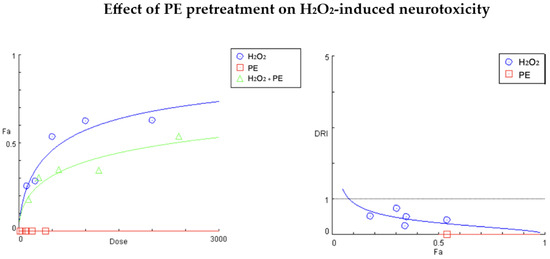 The occurrence and quantitative determination of the neuroprotective effects of both natural products (PE and 3,5-DiCQA) were established using Compusyn® software based on the Chou–Talalay methodology. The automated analysis was performed based on the priorly derived “dose–response” data for each experimental point, according to the protocol described in the previous section. The antagonistic activity of the tested PE and the natural compound DiCQA against the oxidizing agent H2O2 was measured at a fixed (constant) 1:5 ratio between their treatment concentrations at all exposure levels with a 24 h preincubation with the phytoprotectants. Their enhancing effect on cell survival and tolerability to the harmful stimulus was evaluated and interpreted for each experimental data set (actual treatment concentrations) and the nature of the studied drug interactions was determined based on the automated analysis in Compusyn software and the generated combination (CI) and drug reduction (DRI) indices. The CI provides a quantitative determination of synergistic (CI < 1), additive (CI = 1), and antagonistic (CI > 1) drug behavior in fixed- or varying-ratio combinations. Similarly, the DRI (dose reduction index)–Fa plot indicates the fold change in the equi-effective concentrations of a single drug when used in combination (DRI > 1 for synergistic interactions and 0 > DRI < 1 for antagonistic behavior).