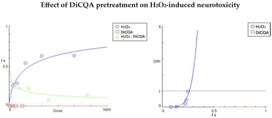 The results of the cytoprotective study with the H2O2:DiCQA combination pair (Figure 3, Table 3) are even more conclusive, showing a dramatic revitalizing effect of the isolated polyphenol DiCQA on injured cell populations in a highly dose-dependent manner. Accordingly, Figure 3 shows a severe decrease in the slope of the “dose–response” curve for H2O2 under DiCQA pretreatment conditions due to the strong ameliorating effect of the phytochemical on H2O2-induced oxidative damage. Similarly to the PE combination study, the greatest improvement was seen in the cellular response at the second concentration pair, where the calculated index of dose reduction suggests a 56.7-fold decrease in H2O2-induced neurotoxicity. This antagonistic pattern is pronounced across the entire treatment range (infinitely high CI values) but gradually subsides towards the lower concentration pairs, reaching a point of non-inferiority at the final one (estimated DRI and CI close to 1).