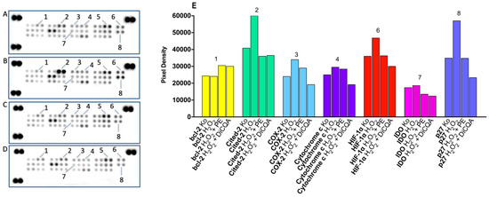 Changes in expression levels of oxidative cell stress-related proteins in SH-SY5Y cells exposed for 30 min to H2O2 in unprotected (B) and PA (C) and DiCQA (D) pretreatment regimens, as compared to untreated control (A). Combination treatments were conducted in the same 5:1 dose ratio (500 H2O2: 100 µg/mL phytoprotectant), with the phytoprotection preceding the noxious stimuli by 24 h. After a total 48 h incubation, a human proteome profiler immunoassay was performed according to the manufacturer’s instructions. Further densitometric analysis of the array spots was conducted using ImageJ software (version number 1.54) and the most prominent changes in the proteome were expressed graphically (E). Legend: 1—bcl-2; 2—Cited-2; 3—COX-2; 4—Cytochrome c; 5—p21; 6—HIF-1α; 7—IDO; 8—p27.