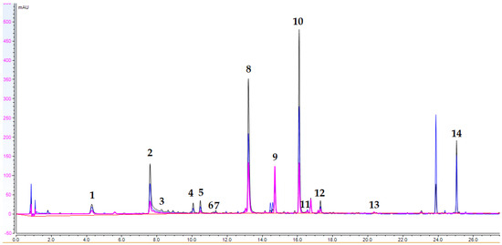 A UHPLC-DAD method for the quantitative determination of the main compounds in P. purpura extract (PE) was developed. A total of 14 analytes, including hydroxycinnamic acids (caffeic (3) and p-coumaric (7) acids), 7 acylquinic acids (2, 5, 5, 6, 10, 11, 12, and 14), 2 caffeoyltartaric acids (caftaric (1) and cichoric (8) acids), and the flavone luteolin (13) and its O-glycoside (9) were determined in PE. Based on the UV spectra and previous LC-HRMS data compounds, 4, 5, 6, 11, 12, and 14 were assigned as acylquinic acids (25). The UHPLC-DAD chromatogram of PE is presented in Figure 5. The content of the assayed compounds is revealed in Table 4. 3,5-diCQA (10) was the major compound in PE, followed by cichoric acid (8), chlorogenic acid (2), and AQA6 (14).