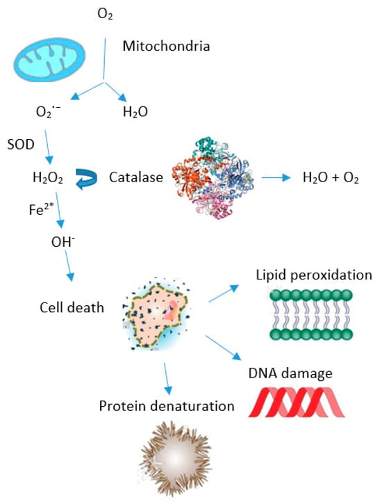 Generation of reactive oxygen species (ROS) and production of natural enzymes as an organism’s self-defense response. The ROS levels are governed by mitochondrial activity. The process commences with the conversion of superoxide radicals O2·− to hydrogen peroxide—H2O2 (which is less toxic) by the superoxide dismutase (SOD) enzyme. Some of these H2O2 molecules—in the presence of ferrous ion Fe2+ are reduced to hydroxyl radical—OH·. This highly reactive ROS attacks various biomolecules (proteins, deoxynucleotide acid—DNA and lipids) and causes cell death. By blocking this pathway and decomposing H2O2 into harmless water and oxygen, catalase provides a defense to the organisms (modified from Rakotoarisoa et al. []).