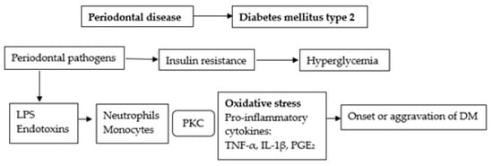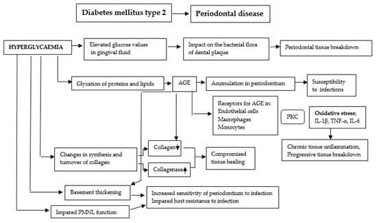 Although the pathogenetic mechanisms implicated in the development of periodontitis in individuals with diabetes have not yet been fully elucidated, vascular changes in the gingiva, immune mechanisms, collagen metabolism disorders, as well as specific microbiological flora in periodontal pockets are discussed in extant literature (Figure 2) [].