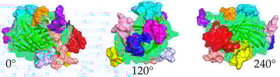 Computer model of DxCruziV3. Views at 0°, 120°, and 240° of the predicted structure. The retained beta-barrel is displayed with a ribbon for the primary sequence and a transparent surface (green). Epitopes are shown with a solid surface in the colors listed in Table 1. Projections obtained with PyMol software (V2.5.5, Schrödinger, NY, NY, USA).