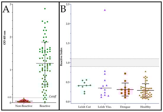 Performance of DxCruziV3ib in an ELISA platform. (A) Measured reactivity (OD405) for individual samples of patient sera diagnosed T. cruzi infected (reactive; n = 75) or not (non-reactive; n = 104) by LACENs in the Brazilian states of Ceará, Sergipe, Paraíba, and Maranhão. Gray line marks cutoff. (B) Cross-reactivity against sera from patients diagnosed with cutaneous or visceral Leishmaniosis, and dengue as well as non-specific reactivity with samples from healthy blood donors (HEMORIO, Rio de Janeiro, RJ, Brazil). Gray line demarks borderline reactivity (±10%).