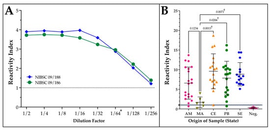 The analytical sensitivity of the in-house ELISA assay was assessed by the application of the two WHO International Biological Standards for Chagas disease that represent patient sera from areas predominantly occupied by T. cruzi DTUs TcI (NIBSC 09/188; Mexico) and TcII (NIBSC 09/186; Brazil/Chile) over a 2-fold serial dilution. After converting absorbance values to a reactivity index (RI), the use of V3ib as the antibody capture reagent resulted in an assay that exceeds the minimum recommended dilution value by a factor of 4 (Figure 3A). One aspect of the two standards is to be able to evaluate the potential for differences in sensitivity related to the geographical origin of the patient samples that could reflect the distribution of different subtypes of T. cruzi. To extend this to our panel of patient serum that represents populations across northern Brazil, the RI was calculated and plotted separately based on geography (Figure 3B). Following an ANOVA statistical analysis with a Kruskal–Willis test, the performance of the ELISA was significantly different in samples from the state of MA to the three more eastern states but not AM.