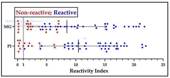 Performance of sV3-LFA in relation to V3ib-ELISA. Serum samples collected in the states of Minas Gerais (MG, BR) in 2022 and Piauí (PI, BR) in 1999 were applied (5 µL) to the sV3-LFA and defined as reactive (blue) or non-reactive (red). The samples were also analyzed by the V3ib, in-house ELISA (1:200 dilution) and their reactivity index calculated with the borderline reactivity marked by vertical gray line.