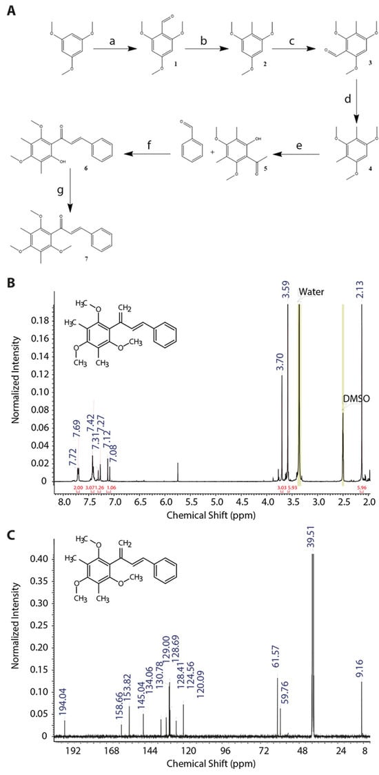 Synthesis path to obtain 3,5-dimethyl-2,4,6-trimethoxychalcone (TriMetChalc). (A) a: Dimethylformamide, phosphorous oxychloride, 0 °C, 1 h. b: hydrazine hydrate, KOH, ethylene glycol 90–145 °C, 4 h. c: dimethylformamide, phosphorous oxychloride, 0 °C, 1 h. d: hydrazine hydrate, KOH, ethylene glycol 90–145 °C, 4 h. e: boron trifluoride ethyl etherate, acetic anhydride, 90 °C, 1.5 h. f: LiOH, ethanol, 25 °C, 16 h. g: K2CO3, dimethyl sulfate, acetone, 50 °C, 12 h. 1H proton (B) and 13C carbon (C) NMR spectra of the final product.