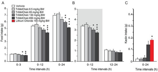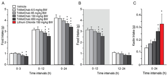 TriMetChalc reduced food intake. (A,B) Cumulative food intake measured over a 24 h period in C57Bl/6J mice per os administered with vehicle (n = 8) or TriMetChalc (6.5 to 650 mg/kg BW, n = 8 for each dose tested). In (B), the dark period is represented by a shaded box. * p < 0.05, ** p < 0.01, *** p < 0.001, significantly different from vehicle-treated mice. (C) Kaolin intake measured in C57Bl/6 mice 24 h after vehicle, TriMetChalc (65 to 650 mg/kg BW), or LiCl (150 mg/kg BW) administration. * p < 0.05 indicates significant difference from vehicle-treated mice.