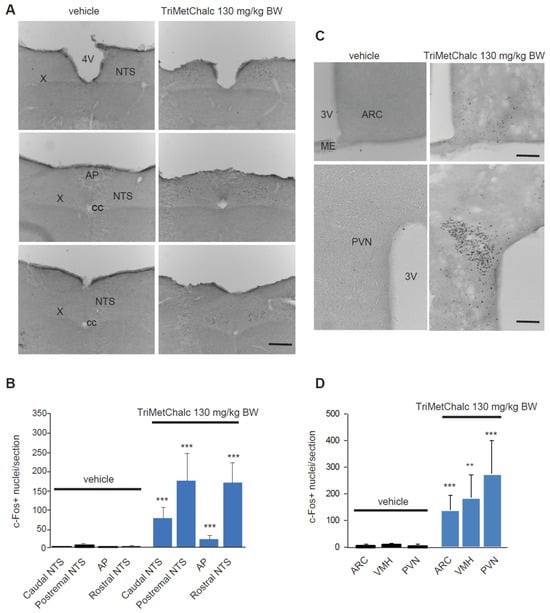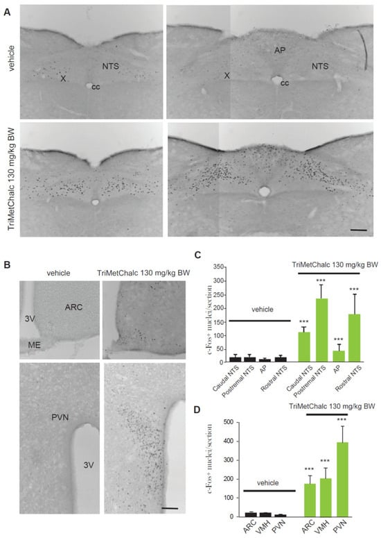 Central structures activated in response to per os administration of 130 mg/kg BW TriMetChalc were next identified using the immune detection of the early gene c-Fos. A very low basal number of c-Fos-positive nuclei were observed in the brainstem, pons, and forebrain of the vehicle-treated mice. The TriMetChalc-treated mice showed a strong increase in the number of c-Fos-positive nuclei within the nucleus tractus solitarius (NTS) regardless the rostro-caudal level considered and a moderate increase within the area postrema (AP; Figure 3A,B). The animals challenged with TriMetChalc also displayed a strong rise in c-Fos immunoreactivity in the within forebrain structures such as the arcuate nucleus (ARC), paraventricular hypothalamus nucleus (PVN), and ventromedial hypothalamus (VMH; Figure 3C,D).