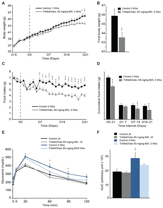 We next sought to determine whether the anorexigenic effect of TriMetChalc could reverse leptin-deficiency-induced obesity. To this aim, ob/ob mice were chronically administered with TriMetChalc once a day for three weeks. We chose to use TriMetChalc at a dose of 65 mg/kg BW, which appeared as a subthreshold dose in the experiments measuring 24 h food intake over its acute administration. Chronic TriMetChalc administration limited the weight gain of the ob/ob mice over the period studied (Figure 6A,B). The weight gain was 7.1 ± 1.4 g for the mice that received the vehicle and 4.0 ± 1.6 g for those treated with TriMetChalc (Figure 6A,B). At the same time, the cumulative food intake over 3 weeks was reduced by 20.9 ± 5.6% following the TriMetChalc administration (Figure 6C,D). Interestingly, the daily food intake was not significantly reduced in the first week but was decreased from day 7 until the end of treatment (Figure 6D), suggesting a cumulative effect of TriMetChalc. We next evaluated the potential impact of chronic TriMetChalc treatment on glucose intolerance, since ob/ob mice develop hyperglycemia and a type II diabetes syndrome. OGTT was performed before and after three weeks of treatment with 65 mg/kg BW TriMetChalc. The results confirmed the development of glucose intolerance over time in this model (Figure 6E,F). TriMetChalc significantly reduced the glycemic response to oral glucose overload in the ob/ob mice, with a more rapid return to basal glycaemia in the treated group than in the control animals (Figure 6E). Quantification of the area under the curve confirmed this observation (Figure 6F).