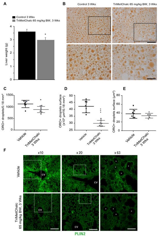 Chronic TriMetChalc administration ameliorates liver steatosis in ob/ob mice. (A) Liver weight measured in control (n = 8) and TriMetChalc (65 mg/kg BW, n = 8) groups at the end of the treatment period. * p < 0.05 indicate significant differences from vehicle-treated mice. (B) Representative photomicrographs of ORO staining observed in vehicle- and TriMetChalc (65 mg/kg BW)-treated ob/ob mice. Black boxes (upper panels) indicate where high-magnification images (lower panels) originated (Scale bar: 10 µm). (C–E) Quantification of ORO+ inclusion number per surface unit (C), total surface covered by ORO+ inclusions (D), and mean surface of ORO+ inclusion (E) in liver of vehicle- and TriMetChalc (65 mg/kg BW)-treated mice. * p < 0.05, *** p < 0.001 indicate significant differences from vehicle-treated mice. (F) Representative confocal images of PLIN2 immunohistochemistry performed on liver slices from vehicle (n = 5)- and TriMetChalc (65 mg/kg BW, n = 5)-treated mice. CV: centrolobular vein. White boxes indicate where high-magnification images originated, asterisks indicate lipid droplets. Scale bars: 200, 100, and 30 µm in ×10, ×20, and ×63 images, respectively.