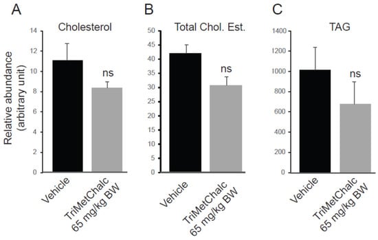 Quantification of free cholesterol (A), cholesterol ester (B), and triacylglycerols (C) in liver extracts from vehicle (n = 8)- or TriMetChalc (65 mg/kg BW, n = 8)-treated ob/ob mice. ns: non-significant difference.