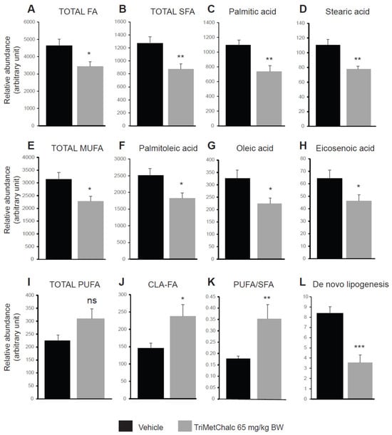 Quantification of FAs (A), SFAs (B–D), MUFAs (E–H), and PUFAs (I,J) in liver extracts from vehicle (n = 8)- or TriMetChalc (65 mg/kg BW, n = 8)-treated ob/ob mice. PUFAs/SFAs ratio (K) and de novo lipogenesis (L) were calculated from data detailed within Table 2. * p < 0.05, ** p < 0.01, *** p < 0.001 indicate significant differences from vehicle-treated mice. ns: non-significant difference.