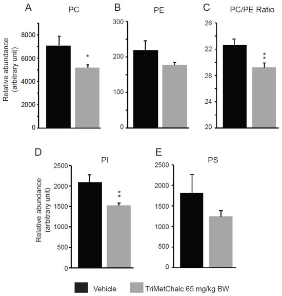 Quantification of phosphatidylcholines (PCs, A), phosphatidylethanolamines (PEs, B), PCs/PEs ratio (C), phosphatidylinositols (PIs, D), and phosphatidylserines (PSs, E) in liver extracts from vehicle (n = 8)- or TriMetChalc (65 mg/kg BW, n = 8)-treated ob/ob mice. * p < 0.05, ** p < 0.01 indicate significant differences from vehicle-treated mice.