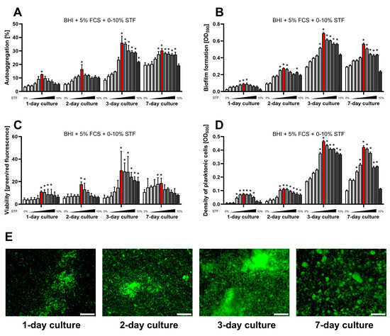 Assessment of the impact of a one-week culture on the physiological parameters of H. pylori 2CML in BHI + 5% FCS and the concentration gradient of STF (0–10%, with 1% intervals). An increasing concentration of STF is marked by the intensified gray of bars. (A) Autoaggregation measured microscopically by estimating the degree of the observation field coverage, n = 3. (B) Biofilm formation determined by a crystal violet staining method and spectrophotometric measurements, n = 9. (C) Viability of bacterial cells determined by fluorescent staining with a LIVE/DEAD kit and a ratio of green/red fluorescence, n = 3. (D) Density of planktonic cells assessed by spectrophotometry, n = 9. (E) A set of images showing the growth of H. pylori 2CML under the most optimal conditions of the current model—BHI + 5% FCS + 5% STF (marked with red bars). Scale bars, 20 µm. * indicates statistical difference (p < 0.05) with the control—0%.