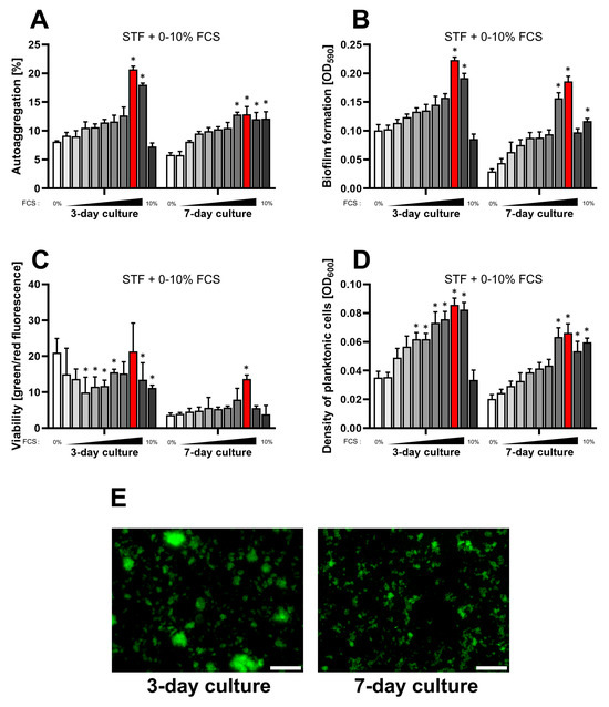 Assessment of the impact of a one-week culture on the physiological parameters of H. pylori 2CML in STF and the concentration gradient of FCS (0–10%, with 1% intervals). An increasing concentration of FCS is marked by the intensified gray of bars. (A) Autoaggregation measured microscopically by estimating the degree of the observation field coverage, n = 3. (B) Biofilm formation determined by a crystal violet staining method and spectrophotometric measurements, n = 9. (C) Viability of bacterial cells determined by fluorescent staining with a LIVE/DEAD kit and the ratio of green/red fluorescence, n = 3. (D) Density of planktonic cells assessed by spectrophotometry, n = 9. (E) A set of images showing growth of H. pylori 2CML under the most optimal conditions of the current model—STF + 8% FCS (marked with red bars). Scale bars, 20 µm. * indicates statistical difference (p < 0.05) with the control—0%. Because of the low values for all the physiological parameters during 1- and 2-day cultures, these data were not recorded.